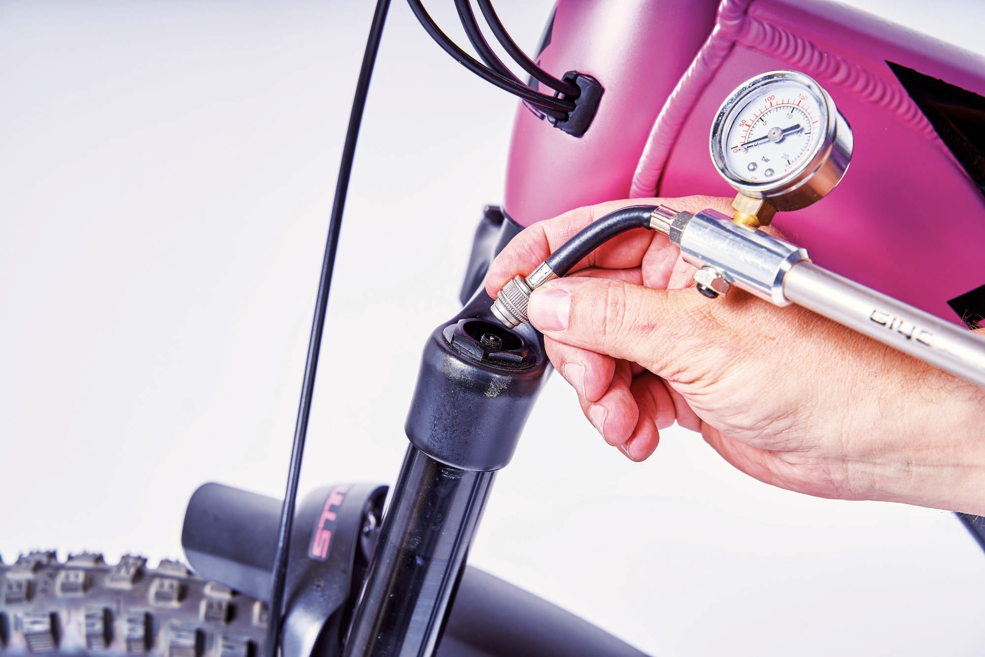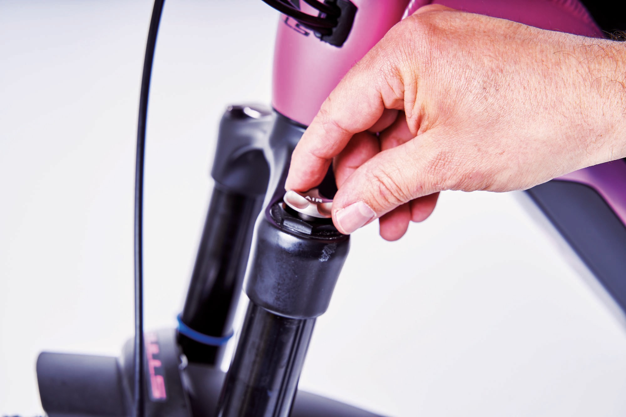 Das Einstellen von Luft-Federgabeln (Bild Mitte) und -Dämpfern (Bild unten) erfordert den Einsatz einer sogenannten „Dämpferpumpe“. Die entsprechenden Ventile befinden sich in der Regel unter einer Abdeckkappe (Bild oben). Achtung: Befolgen Sie unbedingt die Anweisung der Bedienungsanleitung und achten Sie auf die Angaben der Luftfedertabelle!